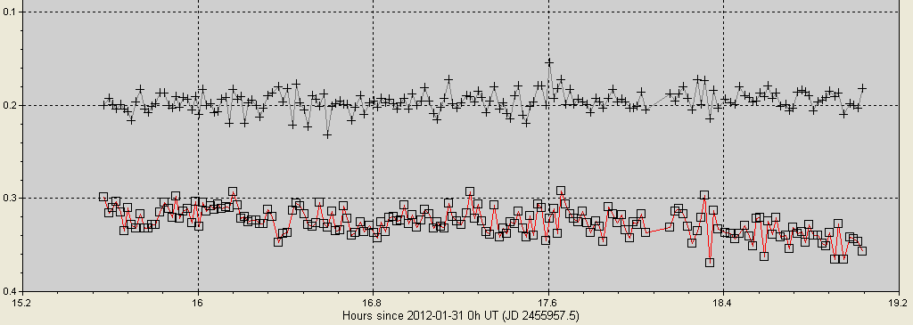 А вот еще одна кривая блеска транзиента в Персее через плотную дымку снятая час назад. Нормально подходит для оценки, что нет колебаний блеска с амплитудой более 0.04 зв. вел. (на более что-то другое данный материал не подходит):