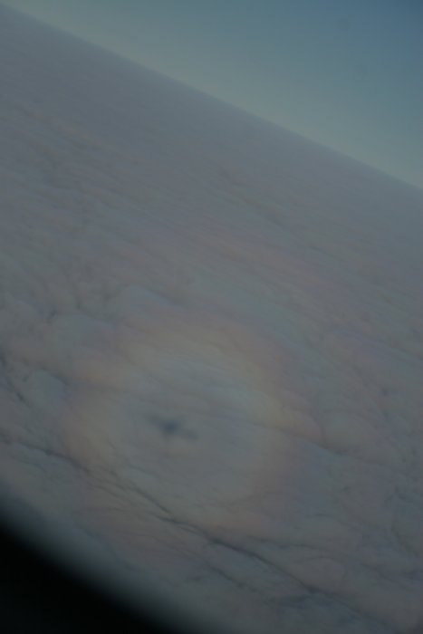 Но все по очереди: нам предстояло ранним утром достигнуть берегов Бразилии. Оно так и состоялось: около 4 утра мы уже пролетали над громадным числом огней Рио-Де-Жанейро и Сан-Паулу. Уже встретив рассвет в разрывах облаков остался Монтевидео. До посадки оставались считанные десятки минут. А я был на изготовке – ждал как в засаде невиданного зверя: Приведения (круговое гало, наблюдаемое только в горах и во время полетов). И вот мы пошли на разворот перед посадкой! Медленно выползла тень самолета из под крыла и тут же засветилось гало радужной каймой! Но оно было не одиночное, а двойное!
